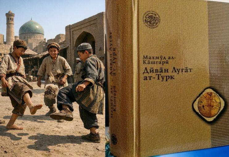 В словаре тюркских языков XI века, который представлен в экспозиции зала, автор фиксирует, как мальчики перебрасывали ногой друг другу лянгу. Спор о том, был ли «тепик» древней формой футбола, идет давно. Исследователи формулируют осторожно: это «игра, в которой ноги выполняют функцию ракеток» — нечто среднее между бадминтоном, чеканкой и современным футболом. И вот уже Кашгари превращается в первого хрониста футбольной культуры тюрков.