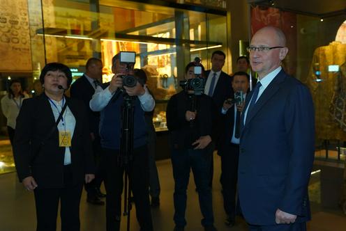 Отдельное внимание было уделено согдийскому периоду. В частности, участникам визита продемонстрировали копию серебряного сосуда с изображением крылатого верблюда, оригинал которого хранится в Государственном Эрмитаже.